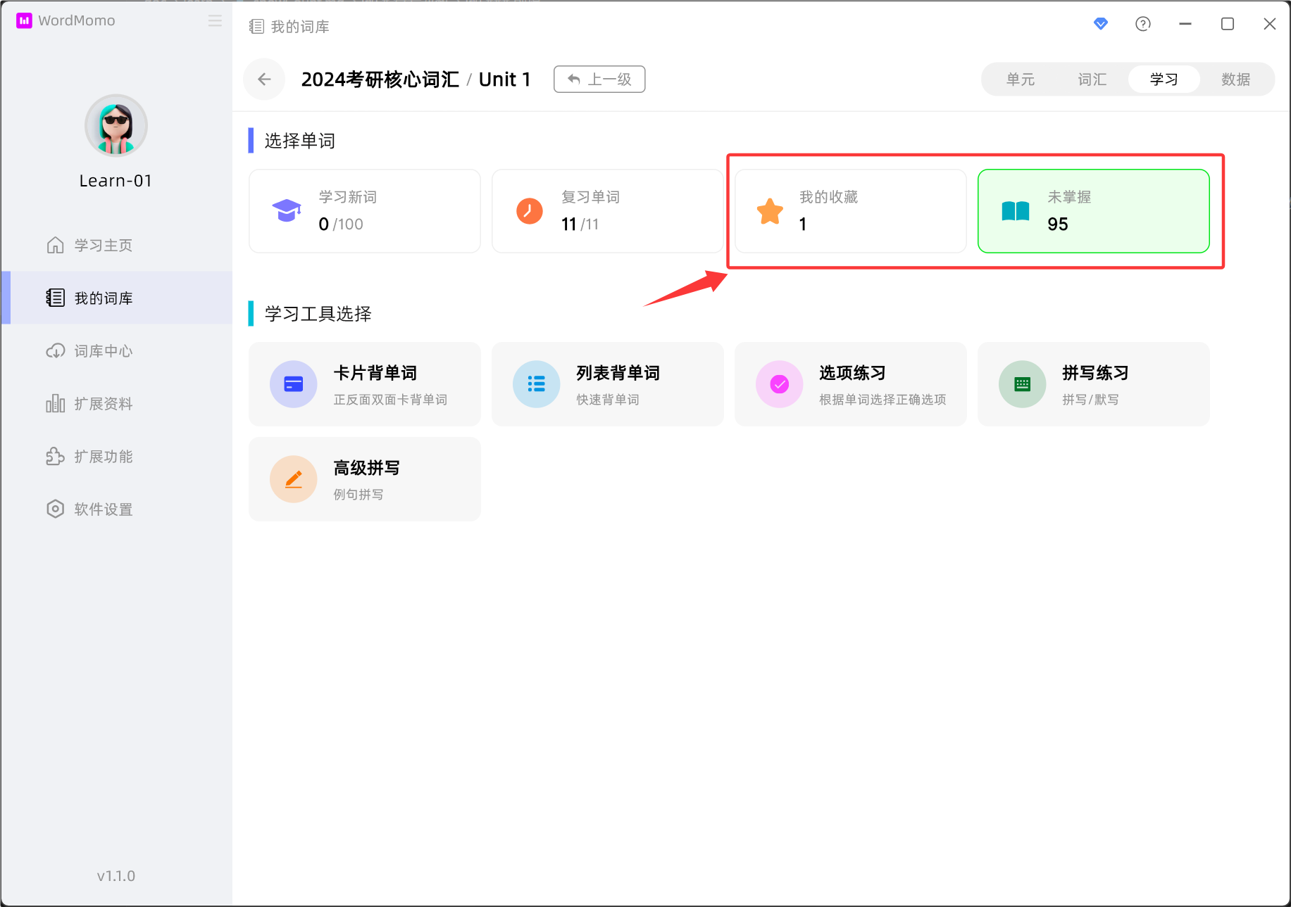 只有 已收藏 ,和 未掌握 ,这两个单词源才有效哦,对于其他的方式的单词源是无效的