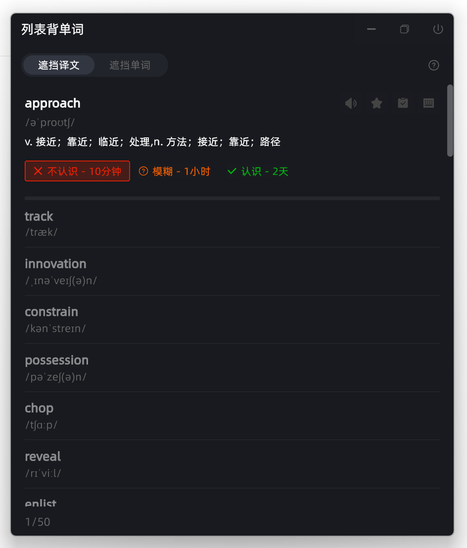 列表快速背单词与卡片背单词不同,这种模式下只会显示单词+译文的信息,用户可以通过方向键左右或者1234键来选择记忆反馈结果