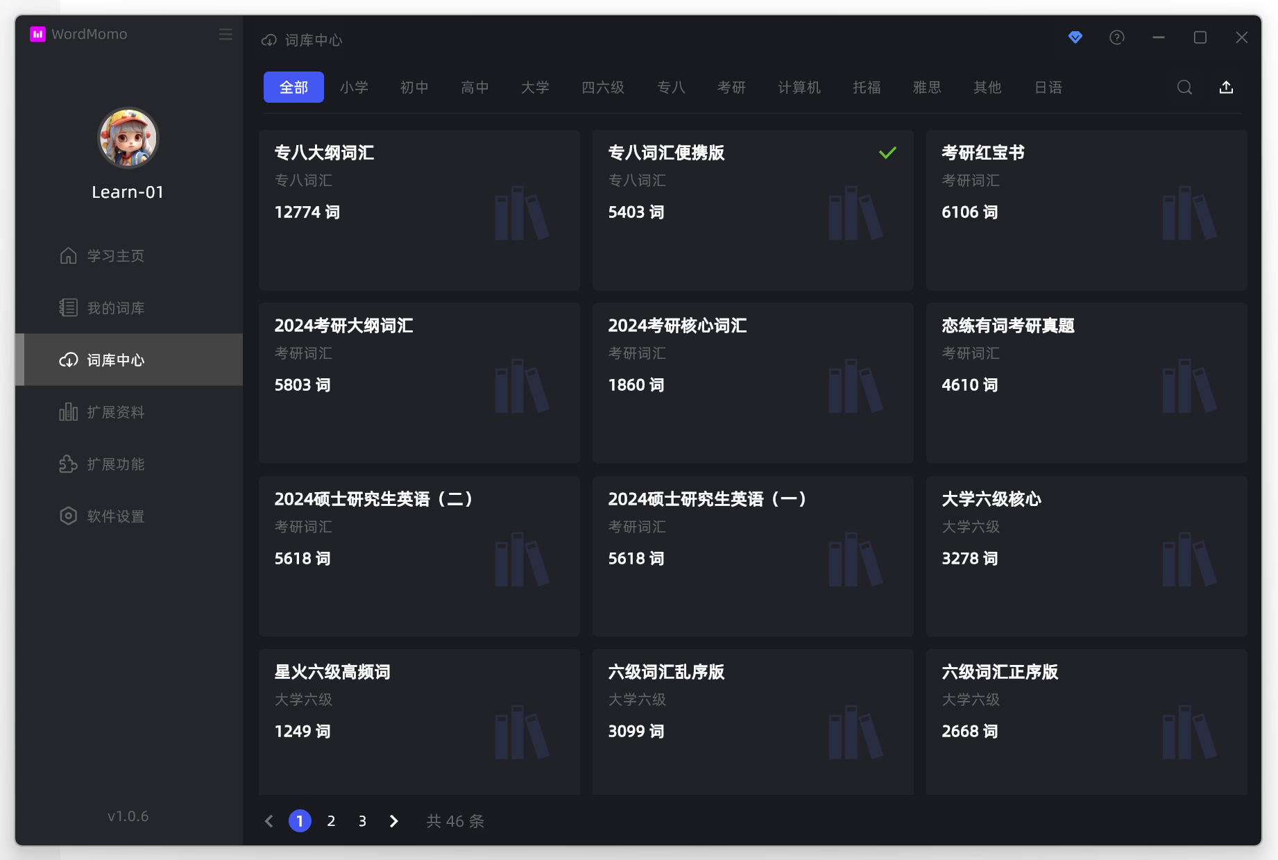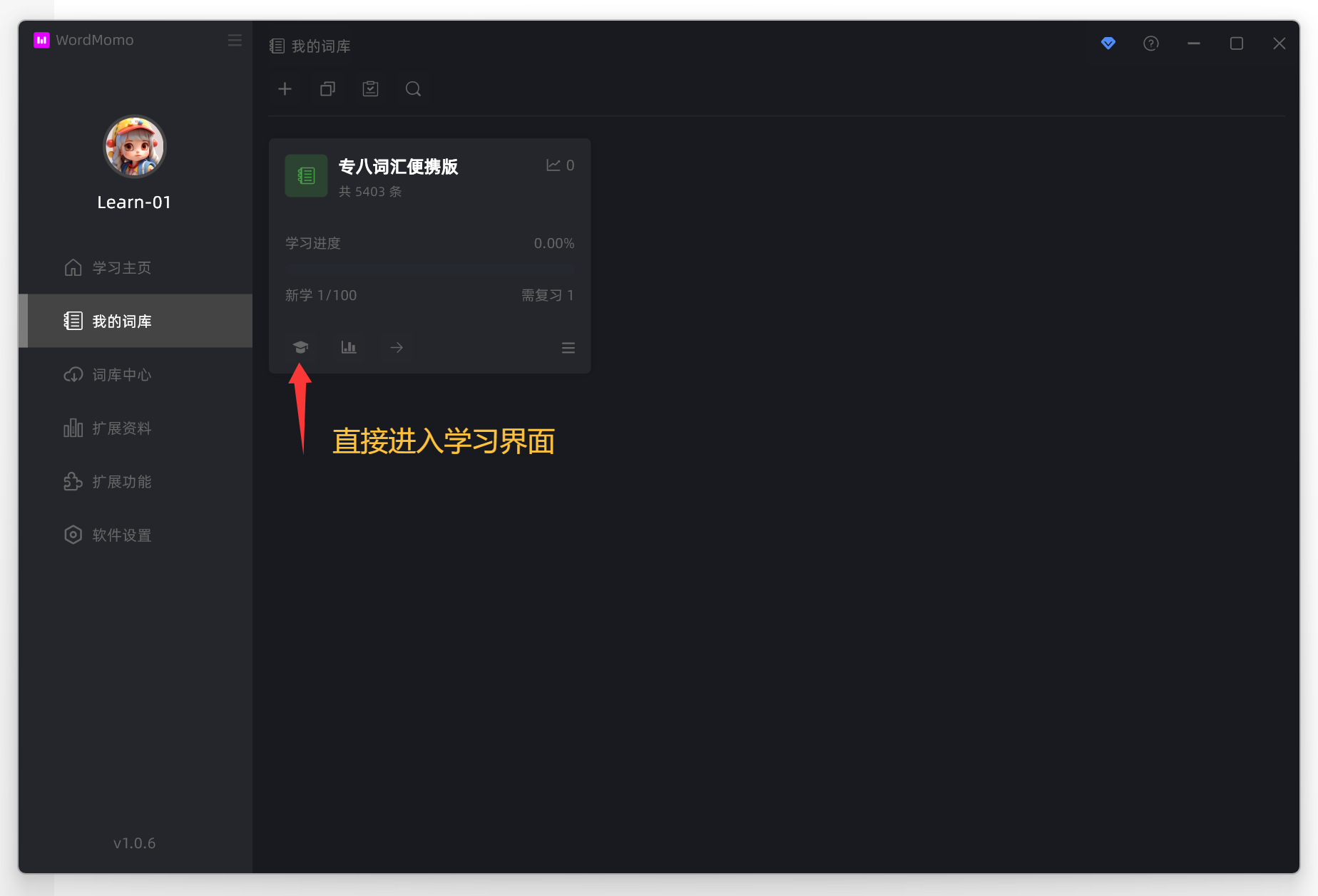 词库下载完成之后,就可以切换到 我的词库 菜单了,你可以在这里看到你所有的词库,以及顶部可以创建空白词库,由于篇幅限制,这里我们可以直接进入主动学习界面