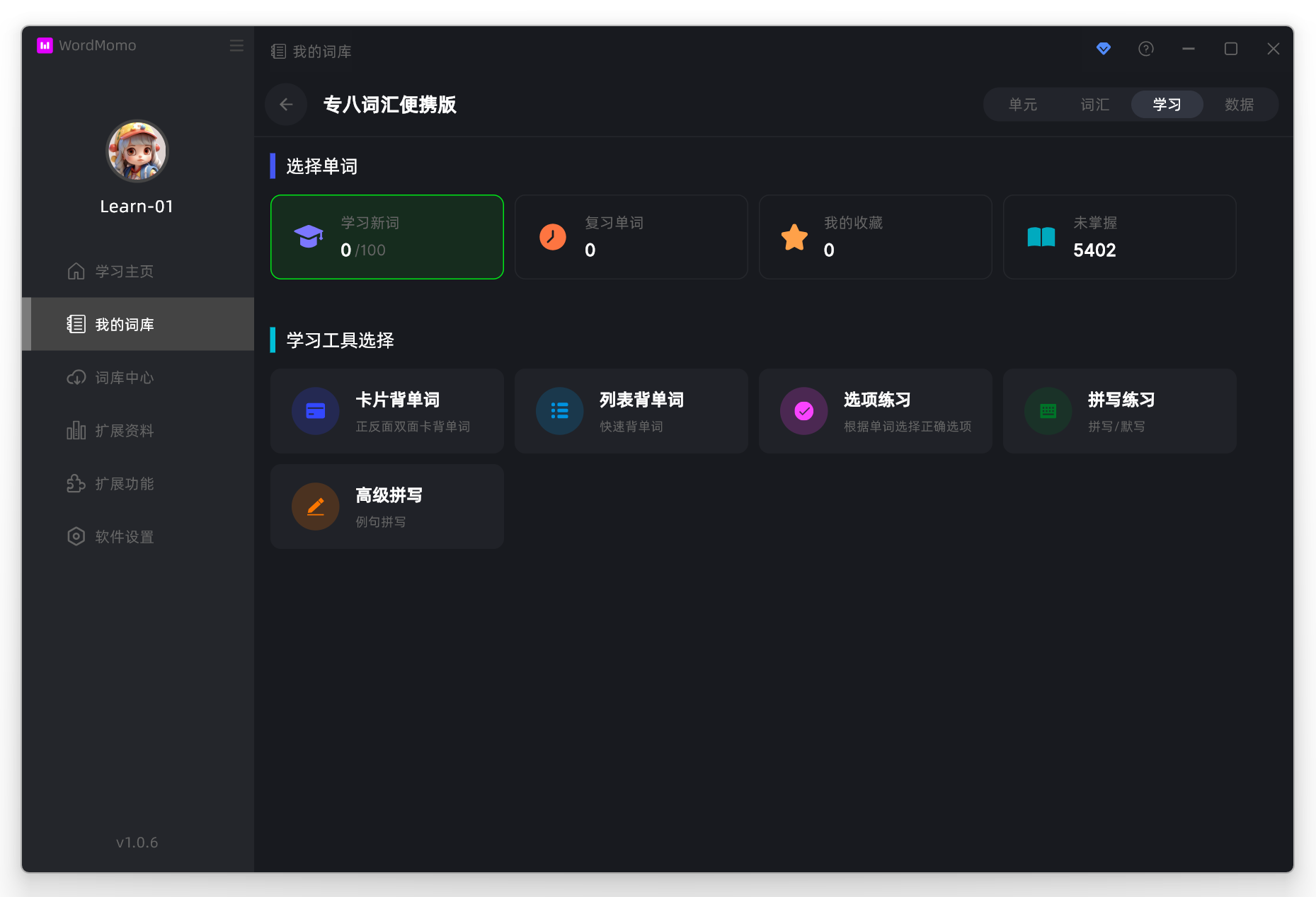 在学习界面,我们需要选择本次学习的单词,因为这个词库是刚刚下载的,单词都没有学习过,所以上面第一部分选择 学习新词 , 为什么学习新词这里显示的是0/100呢? 这里的0/100实际上是今日已学新词数量/今日新词目标数量,而复习单词那里显示0则表示当前没有需要复习的单词