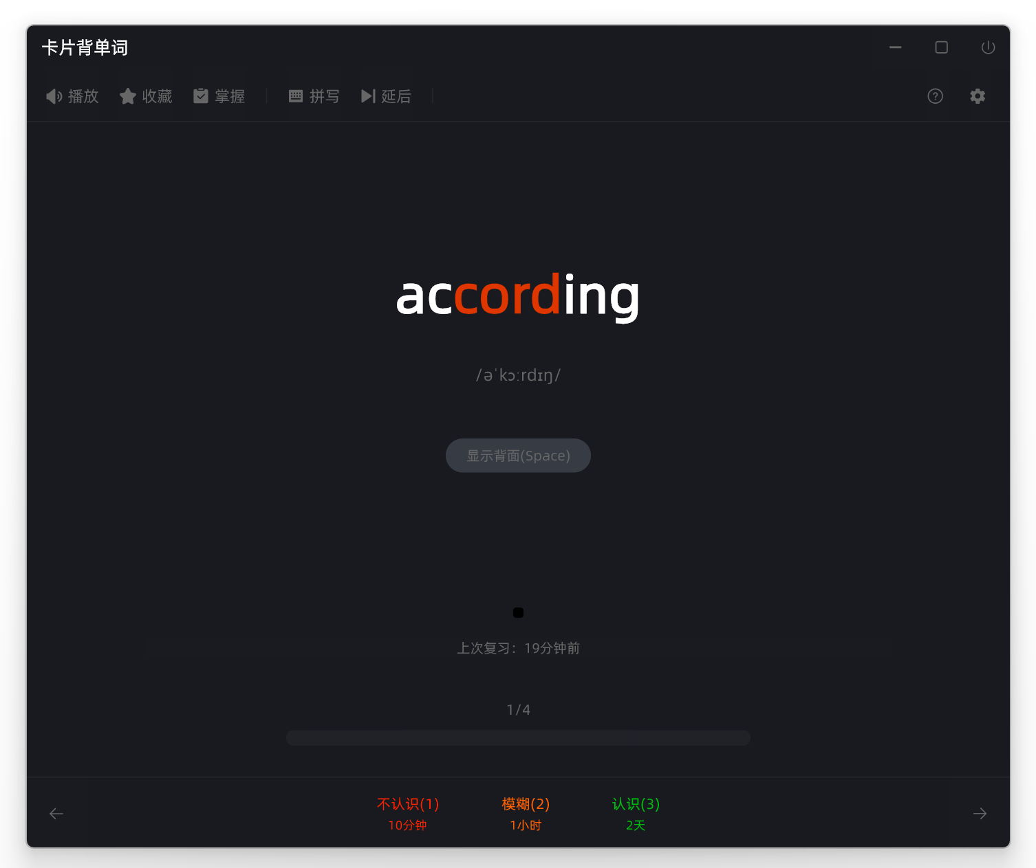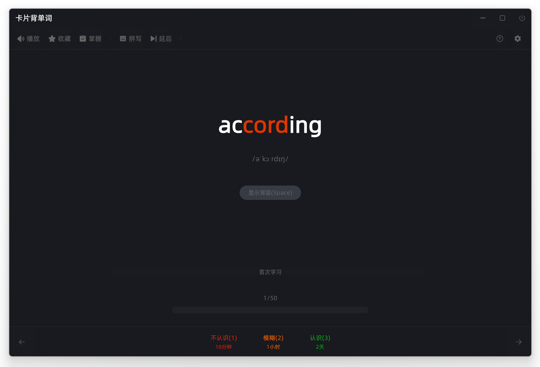 这里我们就拿 卡片背单词 这个学习工具来介绍吧,主要是底部的记忆反馈选项,当前这个单词会根据你的记忆情况反馈,来安排这个单词下次的复习时间