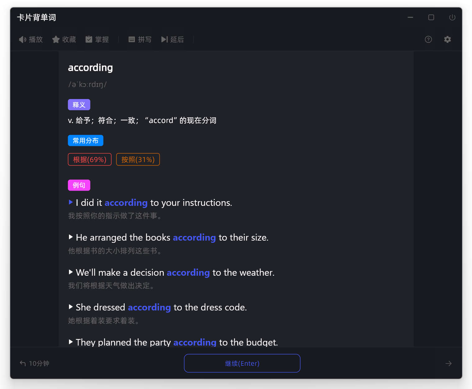 这里我们选择不认识(10分钟后复习),看完这个单词的详细资料之后,我们可以使用回车键进行学习下一个单词了, 不知道顶部有个 延后 的菜单你好奇不,这个延后的意思就是先不对当前这个单词做记忆反馈,把它排队到下一个单词之后,这样在有些用户记忆瞬间遗忘有很大帮助