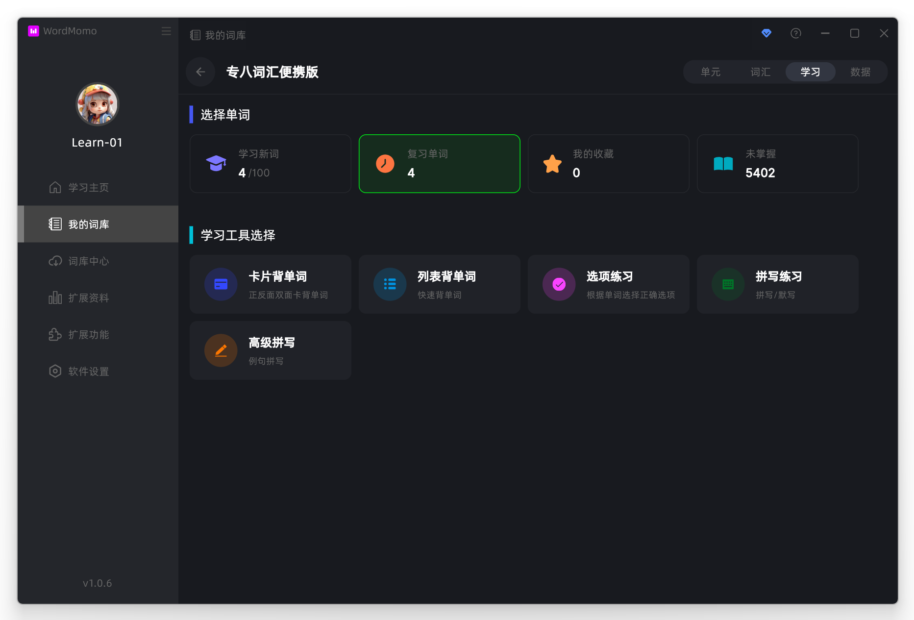 我们再次打开刚刚的词库,进入学习界面,可以看到现在 复习单词 有4个单词需要我们进行复习的了 , 所以这次我们选择复习单词,同样的本次也使用卡片背单词工具