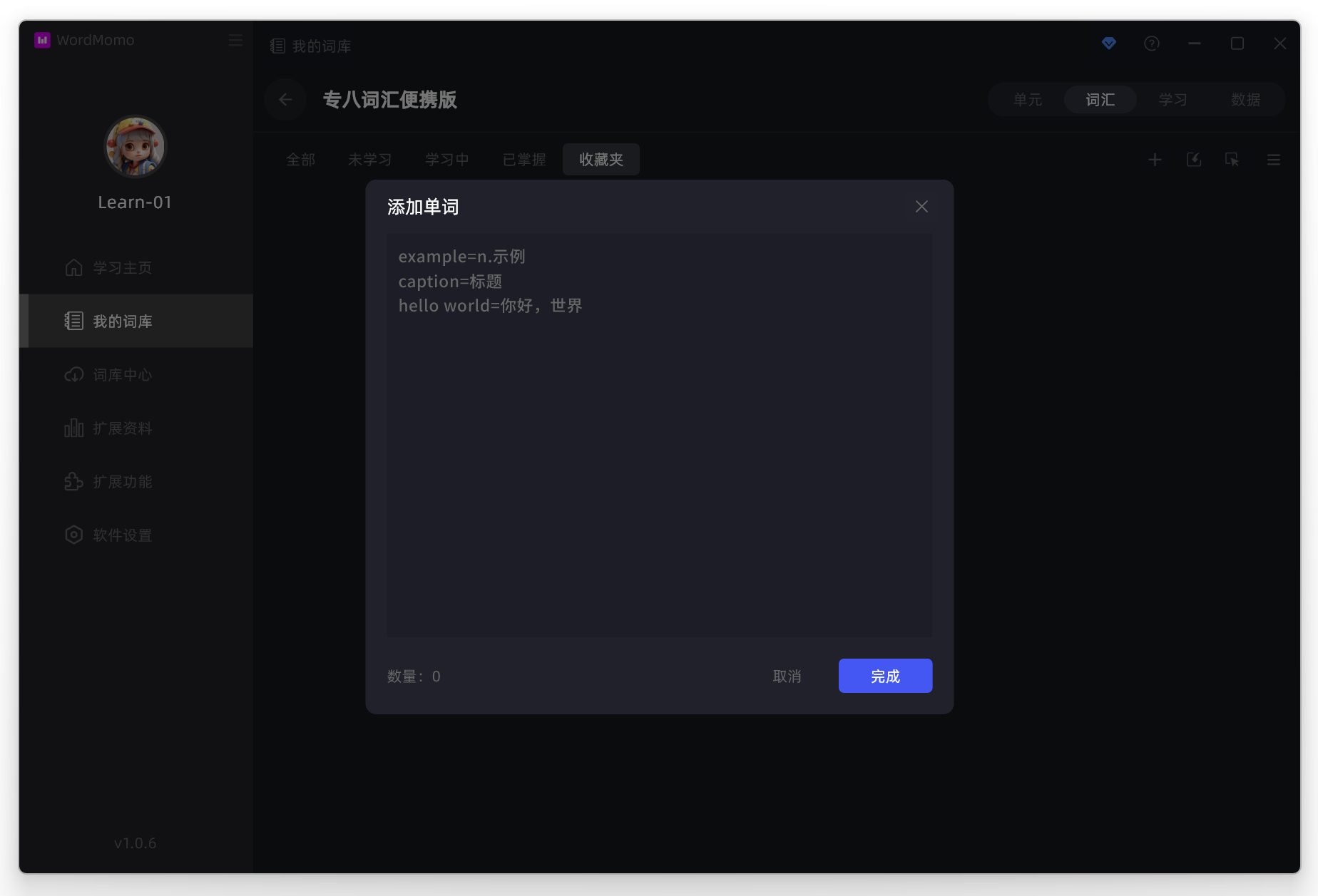 本章将介绍如何在WordMomo中添加、导入单词,其中导入单词最重要的就是两个 单词 + 译文, 这里我们可以创建一个空白词库,进入这个单词管理界面,右边有一个+号 , 打开导入单词窗口